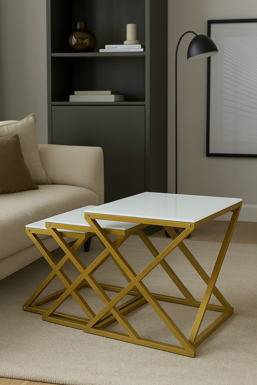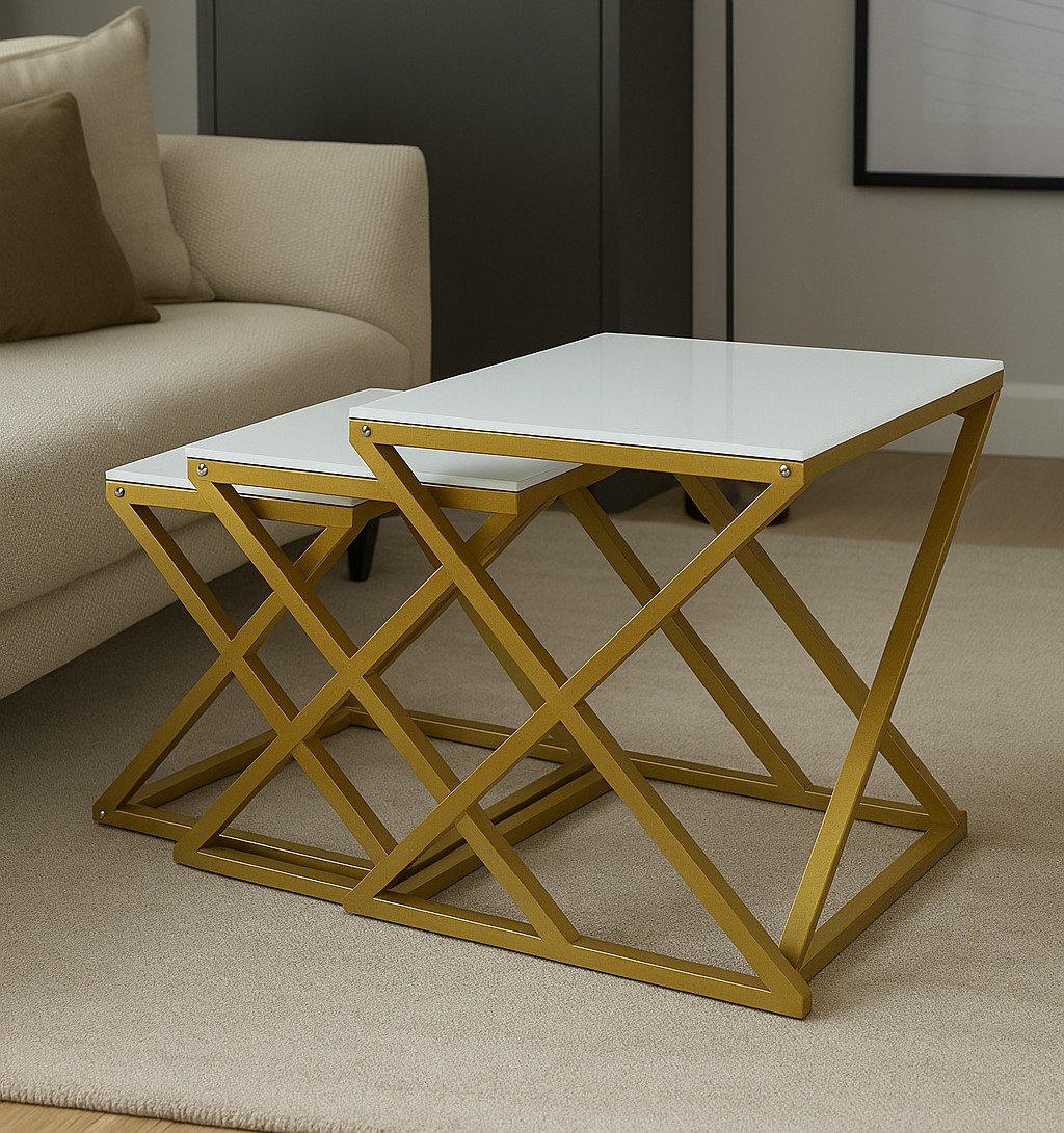 Bring architectural elegance to your space with the Luxe Grid Nesting Tables. This stunning 2-piece set features crisp white tabletops paired with bold, gold-finished geometric bases—creating a striking balance between form and function.