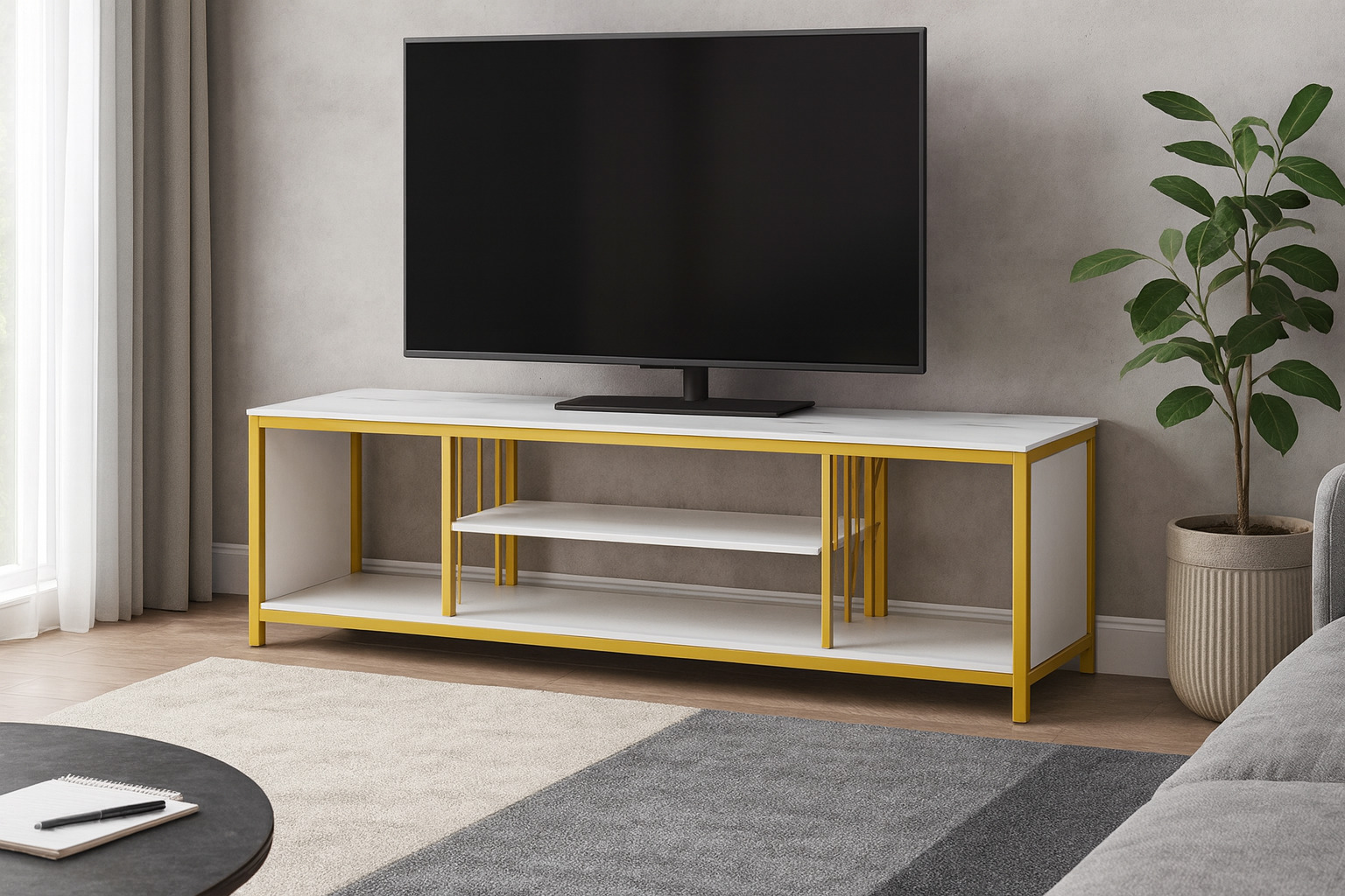 Elevate your living space with the LuxeFrame TV Console, a perfect blend of modern elegance and functional design. Featuring a striking yellow metal frame paired with a luxurious faux marble top, this TV stand is both bold and sophisticated. Its clean lines and open shelving offer ample space for media devices, decorative accents, and storage, making it ideal for contemporary homes