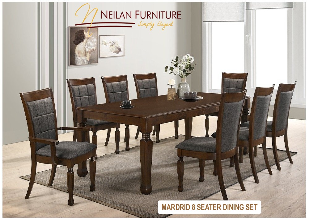 Madrid 8 Seater Dining Set available in Kisumu gives a simple and royal look to your dining space with the systematically and beautifully crafted 8 Seater Dining Set. It has a Dining table and 8 dining chair with Fabric Back. It is made from premium quality Pine wood and available in honey finish.