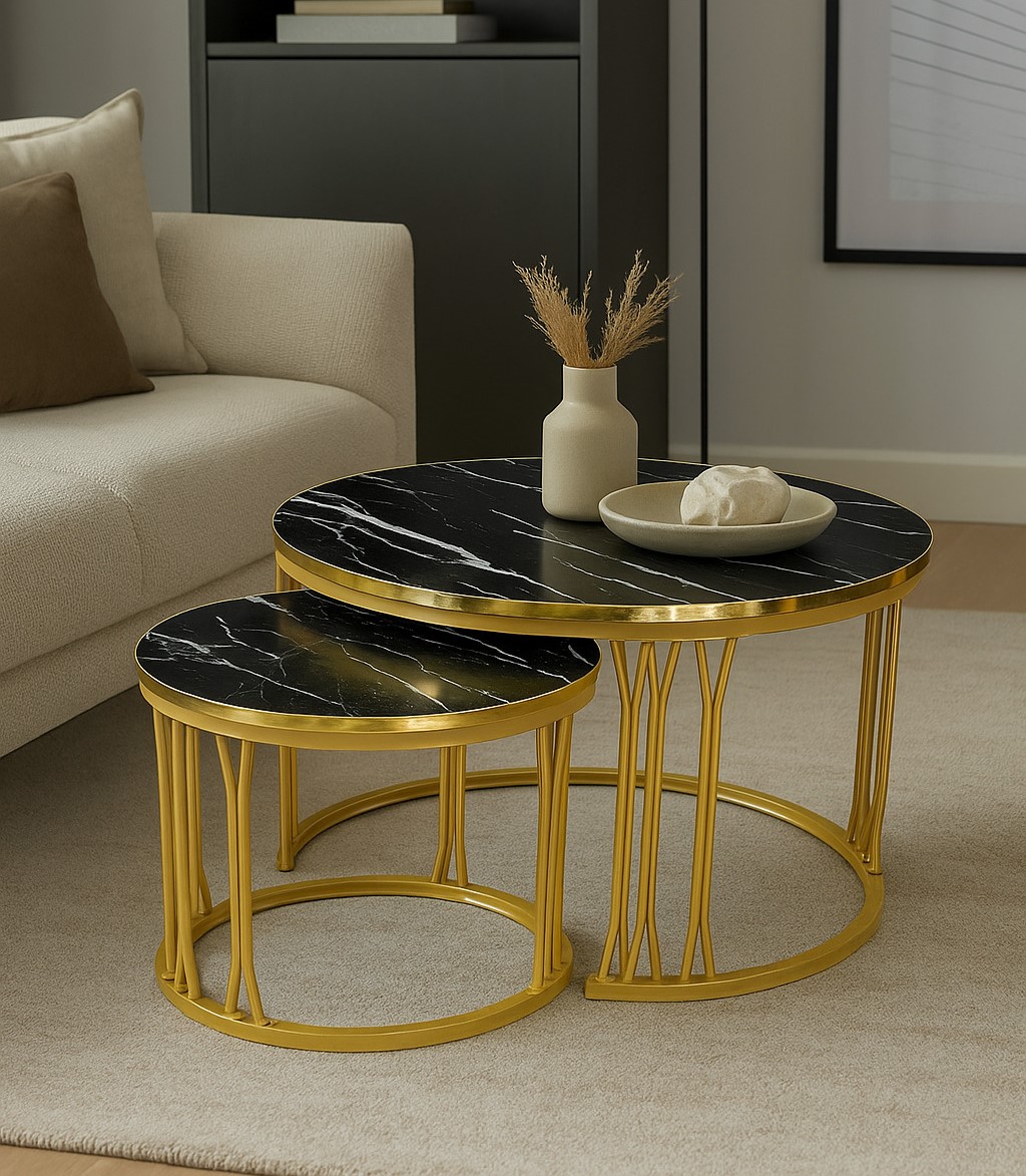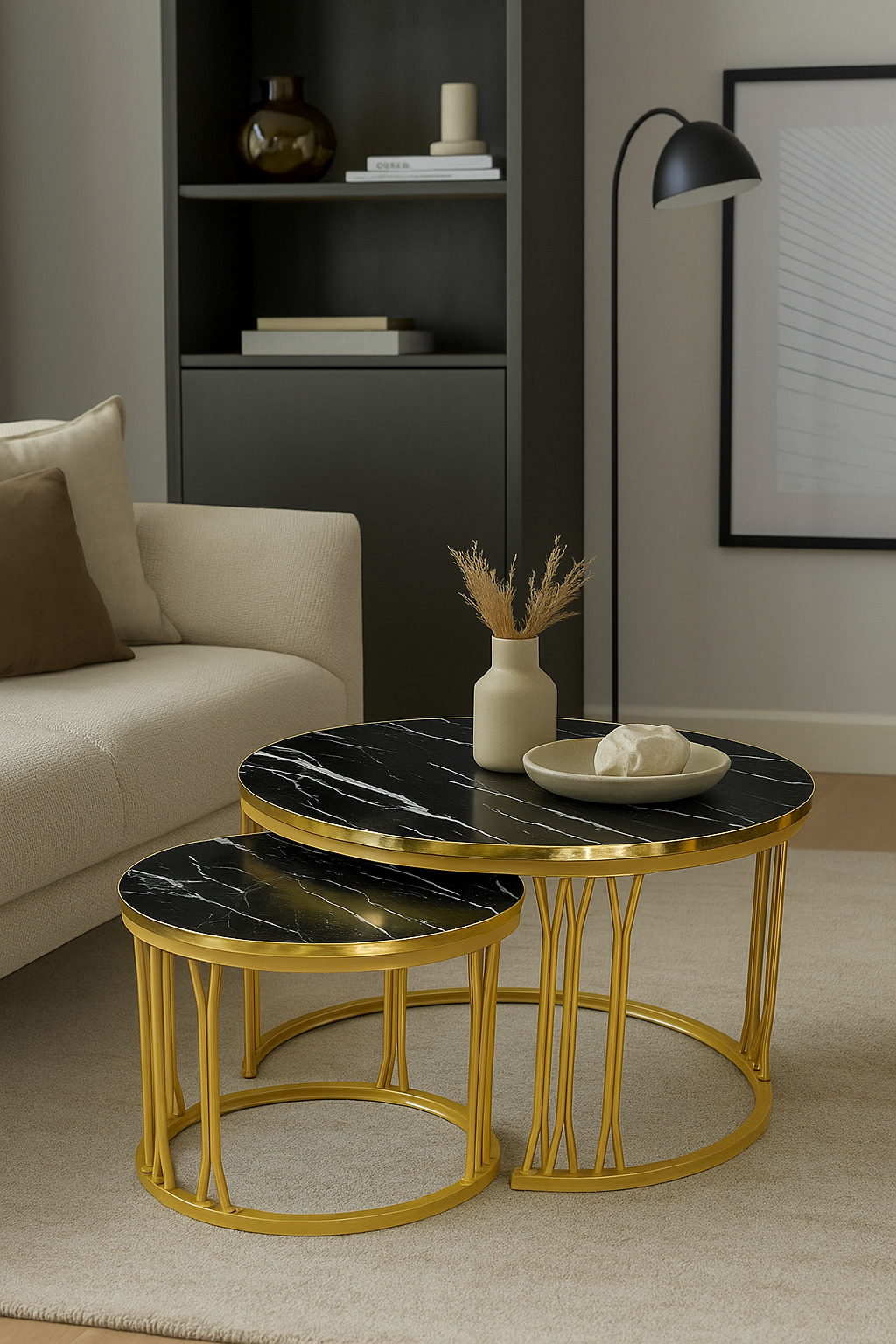 Add a bold touch of elegance to your living space with the Noir Luxe Nesting Tables. This stylish 2-piece set pairs striking black marble-look tops with sleek gold metal frames, creating a modern-chic centerpiece for any room.