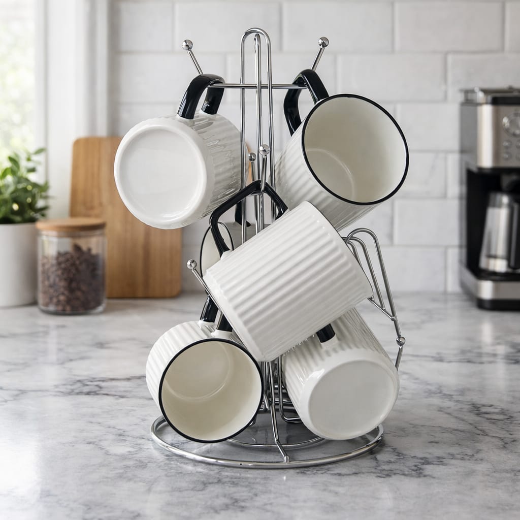 A stylish Nordic-inspired ribbed ceramic mug designed for everyday coffee and tea moments. The clean white finish with a black rim gives it a modern look that fits perfectly in kitchens, coffee stations, and office desks.